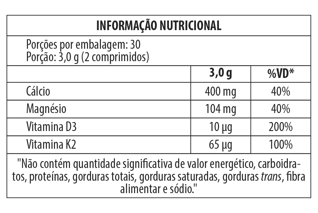 Cálcio Citrato Malato, Óxido de Magnésio, Colecalciferol, Estearato de Magnésio, Croscarmelose Sódica, Dióxido de Silício e Celulose Microcristalina.